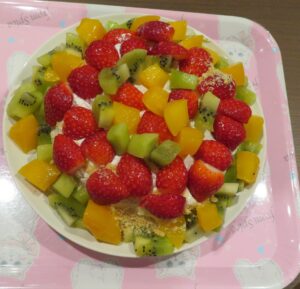 イチゴ、キウイフルーツ、モモ缶を飾り付けます。