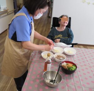 利用者様に見守られながら盛り付けです。