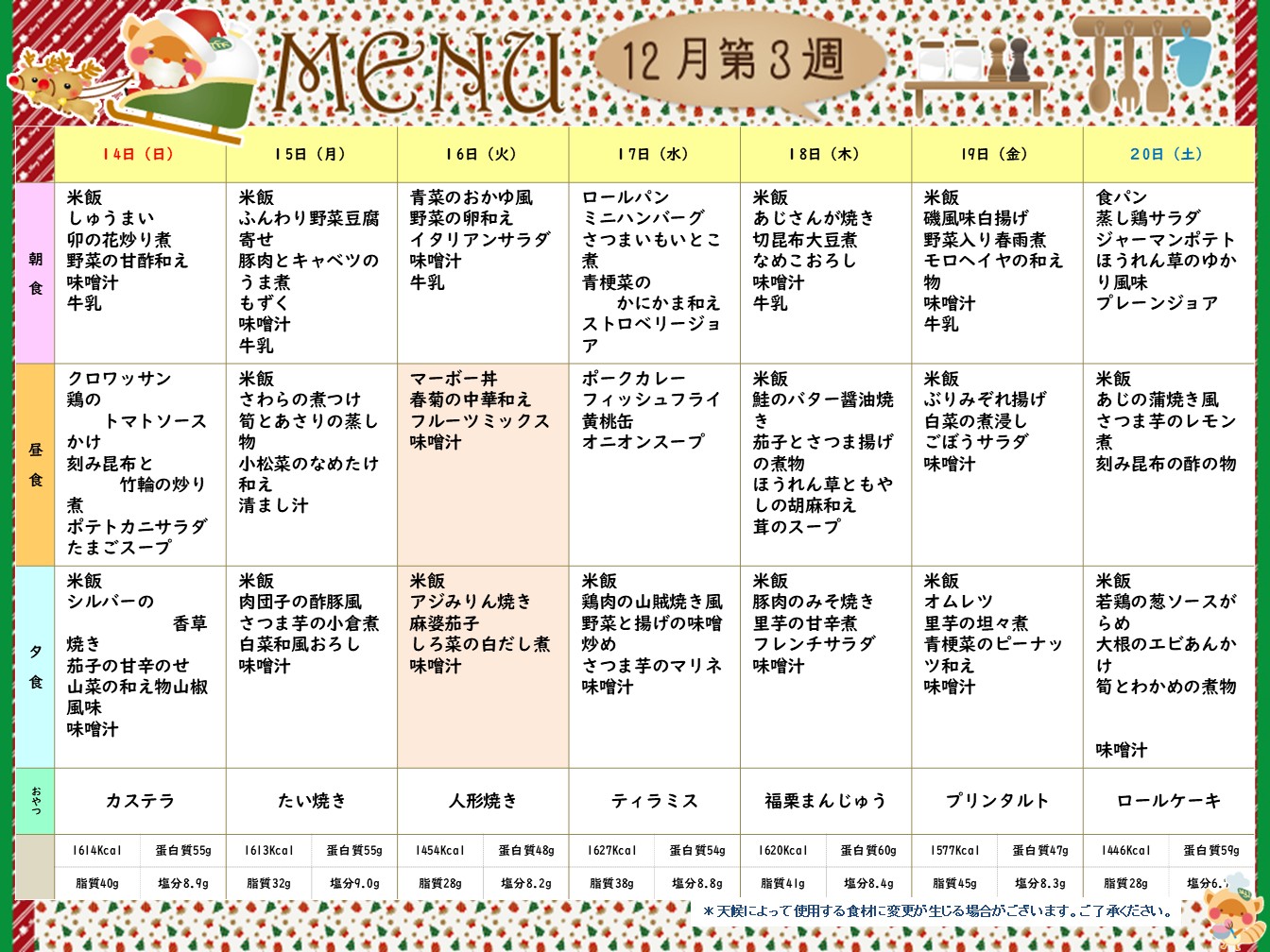 12月第3週(12/14~12/20日)献立表