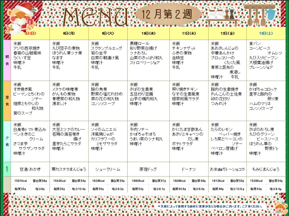 12月第2週(12/7~12/13日)献立表