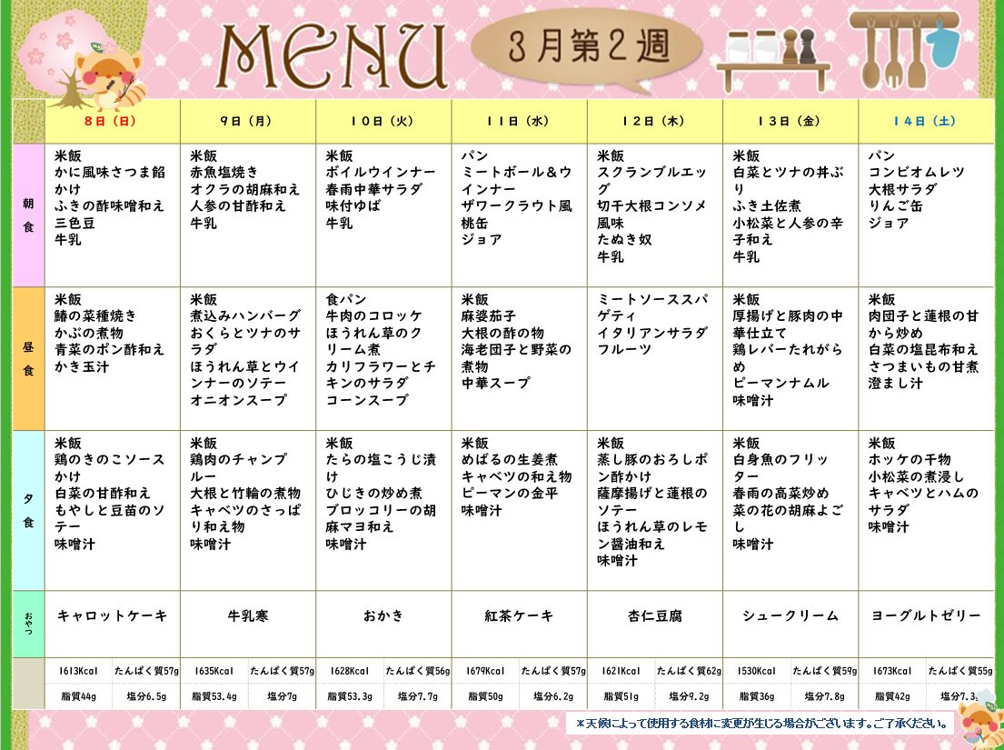 3月第2週(3/8~3/14)献立表